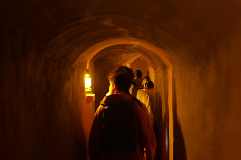 随后,师生们怀着崇敬与好奇的心情走进了地道遗址。在昏暗的灯光下,大家躬身前行,亲身体验了当年抗日军民在仅能容一人通行的地道中迂回作战的艰辛。地道内保留的会议室、掩体、陷阱、翻板等原始设施,让书本上的历史变得可触可感。穿行于这条“地下长城”之中,同学们无不为革命先辈的创造精神和坚韧意志所震撼,深刻理解了“人民战争”的伟大力量。